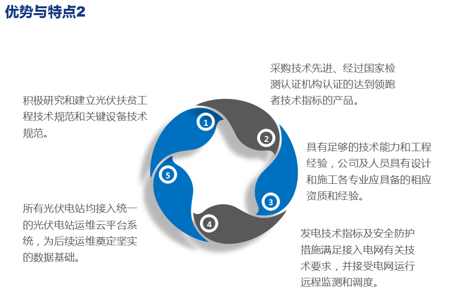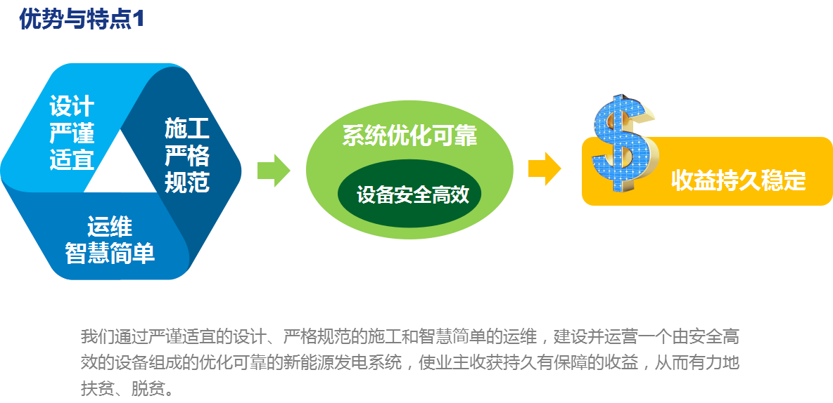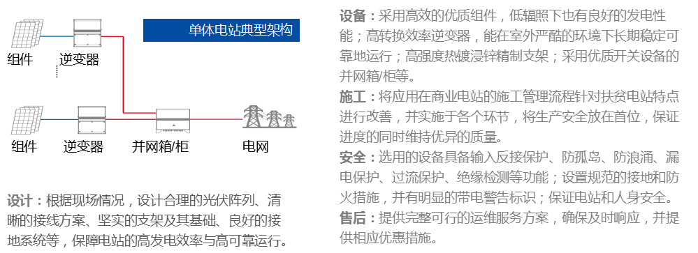 作為一家有擔當的企業,威勝積極參與光伏扶貧工程投資和建設,履行社會責任。我們通過各種方式支持光伏扶貧工程實施:與行業領先者組建光伏扶貧聯盟,配合開展規模化光伏電站建設,因地制宜確定光伏扶貧模式,建立長期可靠的項目運營管理體系。 威勝扶貧光伏電站全生命周期解決方案,致力于從開發、設計、安裝、運維各個階段為用戶提供最專業貼心的服務,通過這些服務,將扶貧光伏電站打造為始終如一的價值最大化的收益型資產,幫助實現精準扶貧、精準脫貧。