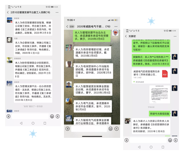 復工前,公司分別與部門經理及高管、勞務派遣公司簽訂防疫管理責任承諾書,落實防疫期間防護措施及管理責任,與員工網簽復工承諾函,督促員工注意自身防護,如有異常及時匯報。