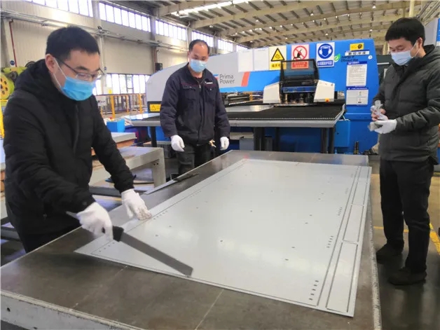要完成任務(wù),主要有兩大困難:一是需要緊急調(diào)配相關(guān)生產(chǎn)配套,尤其是如何在最短時間內(nèi)協(xié)調(diào)核心元器件各項物料到位,實現(xiàn)有序銜接;二是在于如何在短時間內(nèi)切實保障產(chǎn)品質(zhì)量,做到生產(chǎn)的高效、精準。接到任務(wù)的第一時間,智能電氣成套事業(yè)部總經(jīng)理黃水庚和技術(shù)部、生產(chǎn)部相關(guān)人員商討電氣產(chǎn)品方案,憑借標準化圖紙設(shè)計,完成圖紙繪制與技術(shù)資料下達工作。在完成車間現(xiàn)場消毒后,威勝電氣一線員工迅速到崗,一切工作都在緊張而有序的進行著。一次生產(chǎn)運營中心總監(jiān)朱崇明全面部署生產(chǎn)、計劃、倉儲等交付鏈相關(guān)部門,全員武裝、全力投入生產(chǎn)。依靠高效、高質(zhì)的流水線作業(yè),目前,該2個項目完成了鈑金件自制、銅排設(shè)計、銅排制作等工序內(nèi)容。