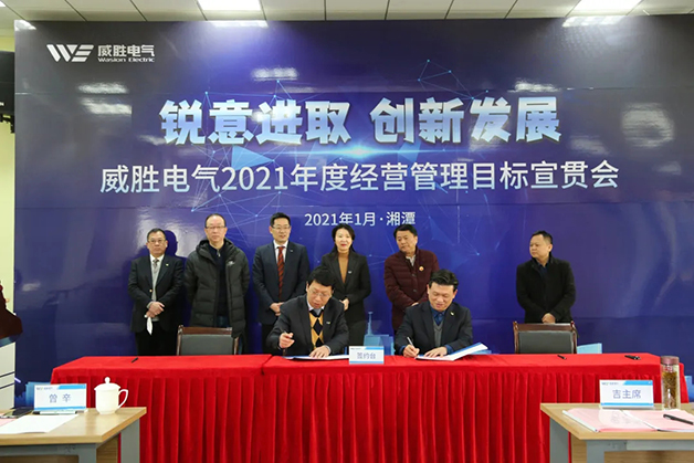 鄧超艷女士宣讀了2021年威勝電氣核心經營管理團隊和核心中層干部的人事任命。在控股董事會及各位領導同仁的共同見證下,電氣董事長、總裁及核心經營管理團隊及核心中層干部正式簽署了2021年度經營目標任務書。