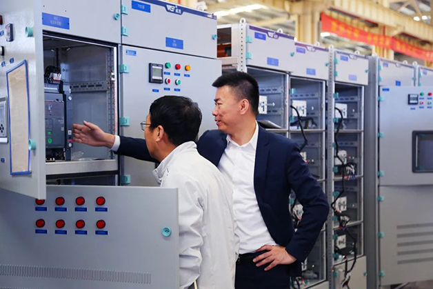 隨后西門子一行人走進了公司現代先進的生產車間,深入自動化生產線、鈑金加工生產線、殼體裝配生產線等多條產線參觀。當走到西門子核心授權我司生產的SIVACON-8PT柜時,韓振華先生高興的說“這跟見到自己家的孩子一般親切”。隨后,他詳細的查看起該產品的生產工藝水平,并如數家珍的給大家介紹了起這款產品的優勢特點。同時,他也高度贊賞威勝電氣在8PT的制造及應用上的創新和工藝制作水準屬于行業領先水平!