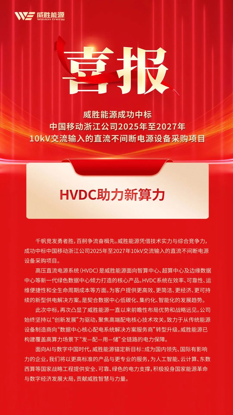 千帆競發(fā)勇者勝,百舸爭流奮楫先。威勝能源憑借技術(shù)實力與綜合競爭力,成功中標中國移動浙江公司2025年至2027年10kV交流輸入的直流不間斷電源設備采購項目。