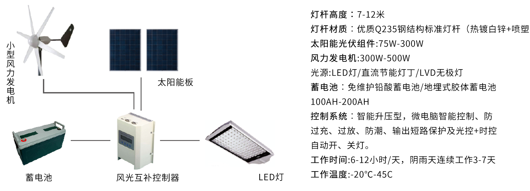 2、風力發電系統:作為路燈應用型風力發電機不僅保障安全性、美觀性及實用性,并且要求低風速(2.0米/秒)啟動,低風速(2.5米/秒)發電。此外,應用在沿海地區時,必須配置機械制動+電磁制動的雙保險制動系統以抵抗最大14級強臺風。在某些特定場景(如沿海地區)下風力發電機的各個部件應具備抗腐蝕的能力。